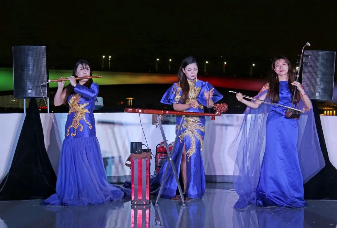 微風(fēng)拂面,夜景怡人,滿載游客的3艘邕江游船來回穿梭在邕江之上,沿江兩岸燈光絢麗多彩,跨江大橋恢弘大氣,民樂表演風(fēng)情十足,乘船游客紛紛拿出手機(jī)、相機(jī)合影留念。