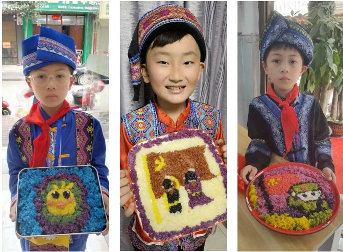 “長(zhǎng)桌宴”又稱(chēng)合攏宴,是侗族、苗族、瑤族等多個(gè)民族的風(fēng)俗習(xí)慣,常用于接親嫁女、滿月酒、村寨聯(lián)誼等宴飲活動(dòng),代表最為隆重的待客禮俗,已有幾千年歷史。“長(zhǎng)桌宴”上有壯族特色的五色糯米飯、艾葉糍粑、壯粽,苗族的傳統(tǒng)佳肴,還有黎族的三色飯……一份份美食造型美觀、色彩鮮艷、香味撲鼻。圖為集團(tuán)職工拍攝的孩子參加學(xué)?!叭氯被顒?dòng)。