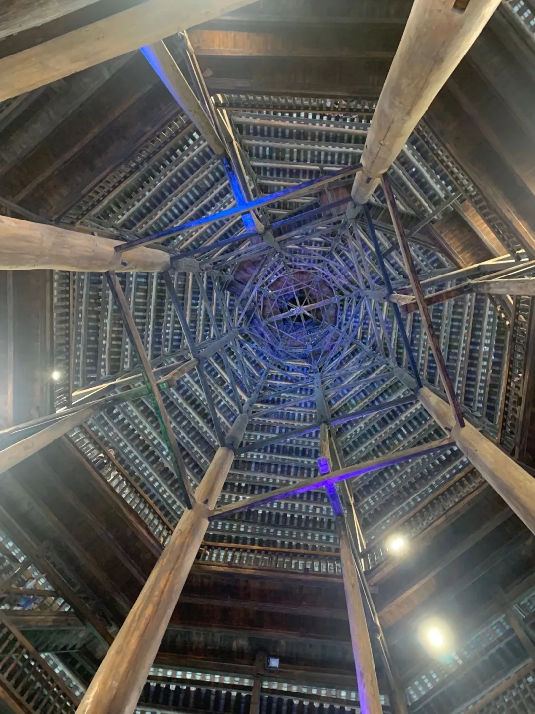 仰觀閃閃魔幻,感受侗族建設(shè)的精美藝術(shù),把疏密、粗細(xì)、剛?cè)岬韧昝赖亟Y(jié)成一個整體,展現(xiàn)侗族工匠的精美建筑技藝。不用一顆鐵釘,結(jié)構(gòu)十分嚴(yán)謹(jǐn)穩(wěn)固。樓內(nèi)四根杉木大柱直徑都超過70厘米,樹齡均在百年以上,這在鼓樓建筑史上是唯一的。